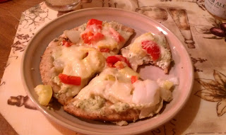 7:30pm Veggie Pizza made with Whole wheat Pita and red bell pepper,zucchini, red onion, cream cheese and pesto and Shredded Italian FiveCheese